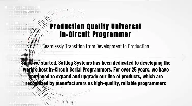 Softlog Systems has been a leader in In-Circuit Serial Programming (ICSP™) for over 25 years, delivering high-quality, reliable solutions trusted by manufacturers worldwide.